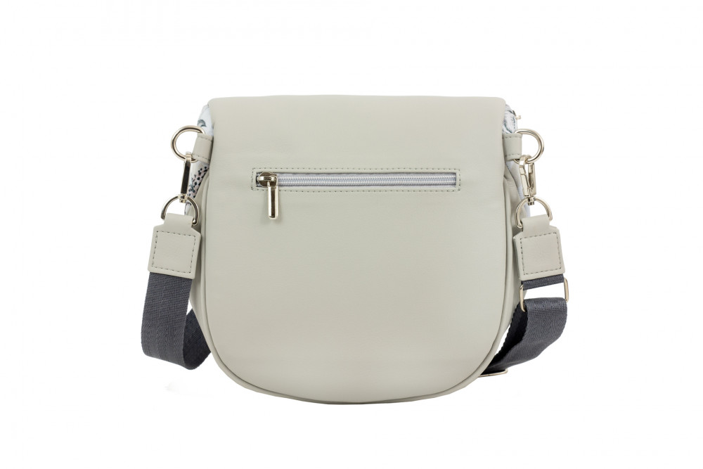 Anyaga magas minőségű textilbőr és vízlepergetős anyag, bélése vízlepergető. Egyterű, kívül (hátul) és belül cipzáros zsebbel. Teteje cipzárral záródik. Vállpántja szatén heveder. Táska mérete 21x22x10cm, pántszélesség 30mm, pánthossz állítható 75-135cm-ig. Belső cipzáros zseb 13x12 cm, külső cipzáros zseb 13x12cm.