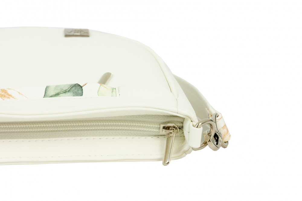 Belül cipzáros, és nyitott zsebbel. Kívül elöl cipzáros,hátul nyitott zsebbel. Fedele cserélhető patentos, rejtett mágneszárral záródik, fedél alatt cipzáros.
