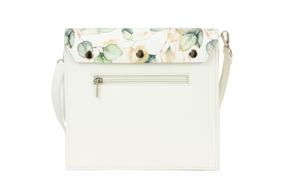 Anyaga magas minőségű textilbőr és vízlepergetős anyag, bélése vízlepergető. Válltáskaként és keresztbe is hordható. Belül egyterű, kívül(hátul) és belül cipzáros zsebbel, mobiltartóval. Fedele cserélhető, patentos. Vállpántja lecsatolható karabíneres. Fedele mágneszárral záródik. Táska mérete 25x23x6,5 cm, pántszélesség 20 mm, pánthossz állítható 74-136cm-ig, belső cipzáros zseb 15x13 cm, külső cipzáros zseb 15x12 cm, mobiltartó 10,5x8,5 cm.